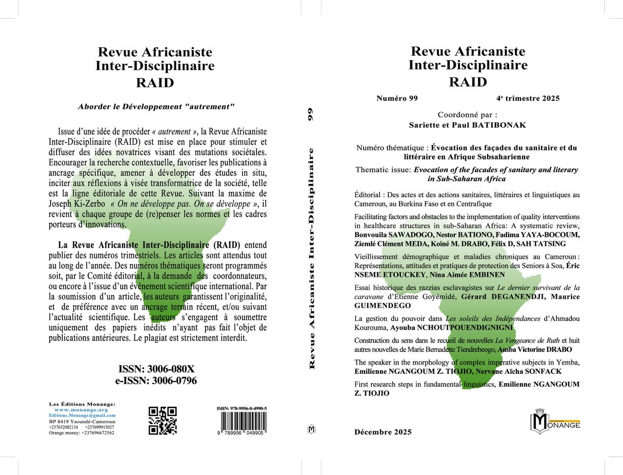 Les réflexions universitaires sont en mesure de changer la donne sociale lorsqu’il existe une cohérence entre les scientifiques et les politiques ou les gouvernants. Cet aspect constitue un des pans de la ligne éditoriale des Éditions Monange et de celle de la Revue Africaniste Inter-Disciplinaire (RAID). Ce volume évoque des façades des questions sanitaires et littéraires au Cameroun, au Mali et en Centrafrique et représente le numéro 99e de cette RAID. Il convient de relever que des actes et des actions dans les domaines sanitaires et littéraires prennent des couleurs intéressantes et elles ont été jugées pertinentes pour l’analyse. (Lire la suite dans le document)